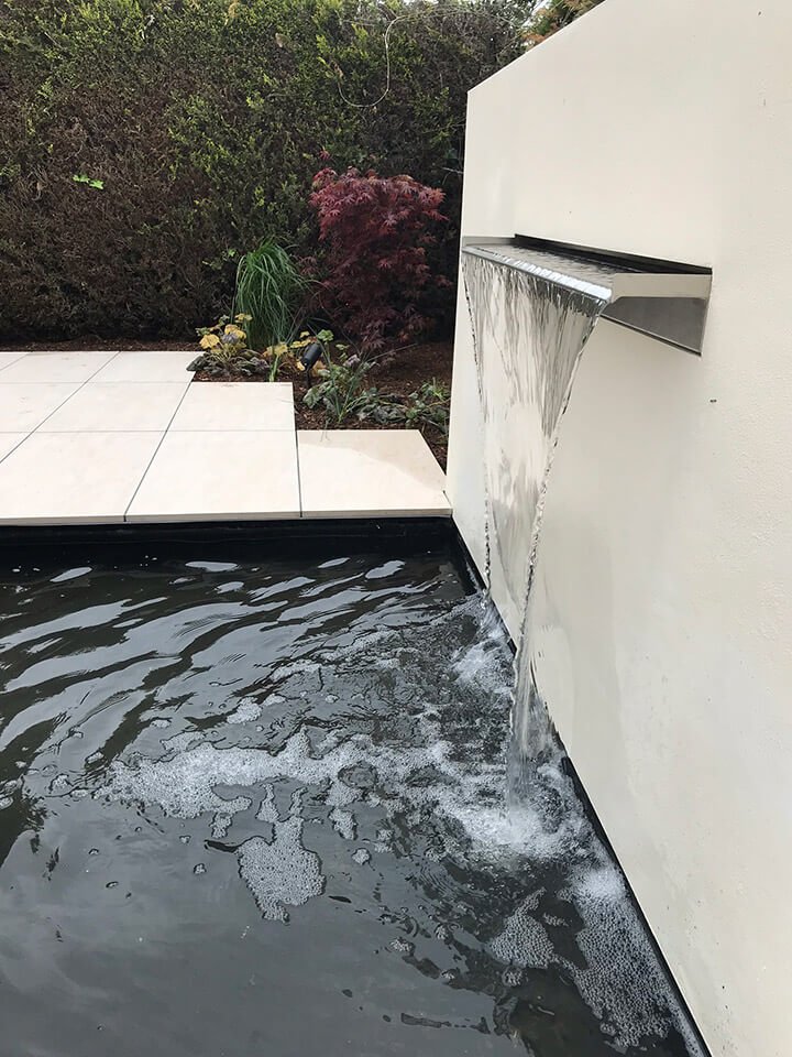 The main focal point is the wall houses a centrally positioned water blade wall with water cascading into a linear pool bringing sound to the garden. This appears to lead to the second water feature, a shallow pool with three centrally positioned porcelain paving stones which have been drilled to allow a bubble fountain to push though with a gentler motion.