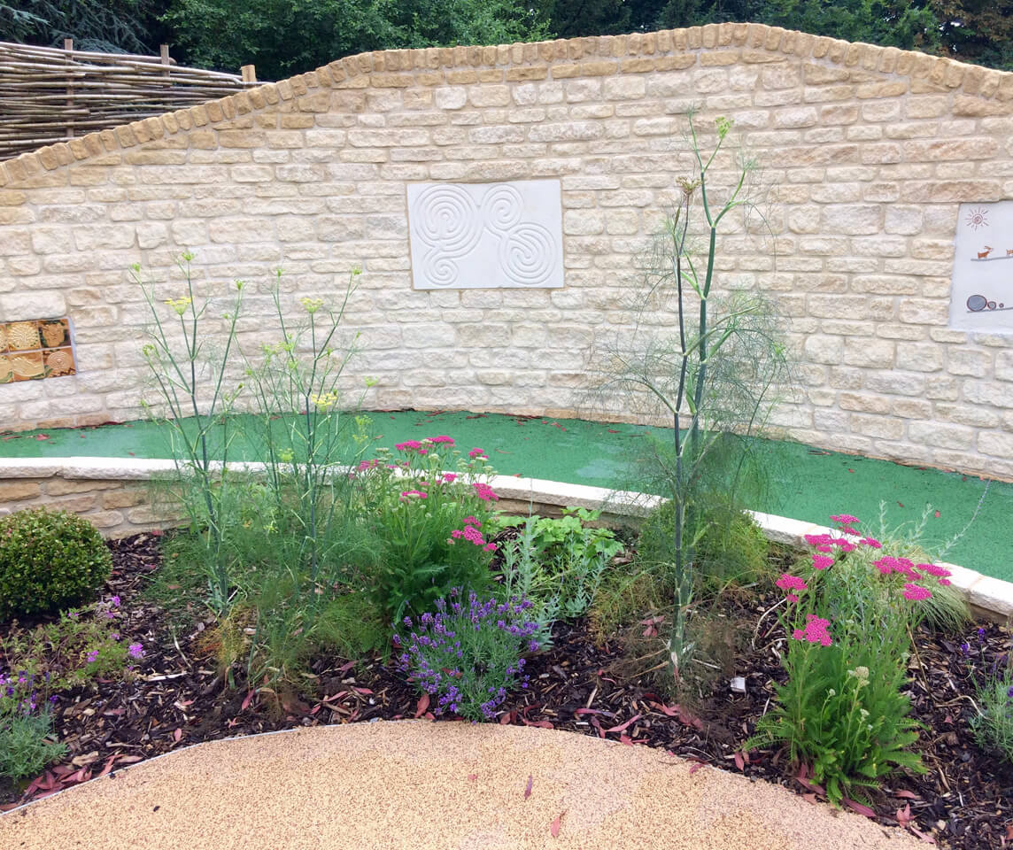 This large area provides a much-needed open area with a lawn, bucket swing, more sensory planting, a pergola with scented jasmine, wind chimes, motion sensor sound effects and a feeling of space. An ammonite has been embedded into the wall here as a link to Julia’s House in Broadstone and in turn there is a Devizes White Horse on one of the curved walls in their garden.