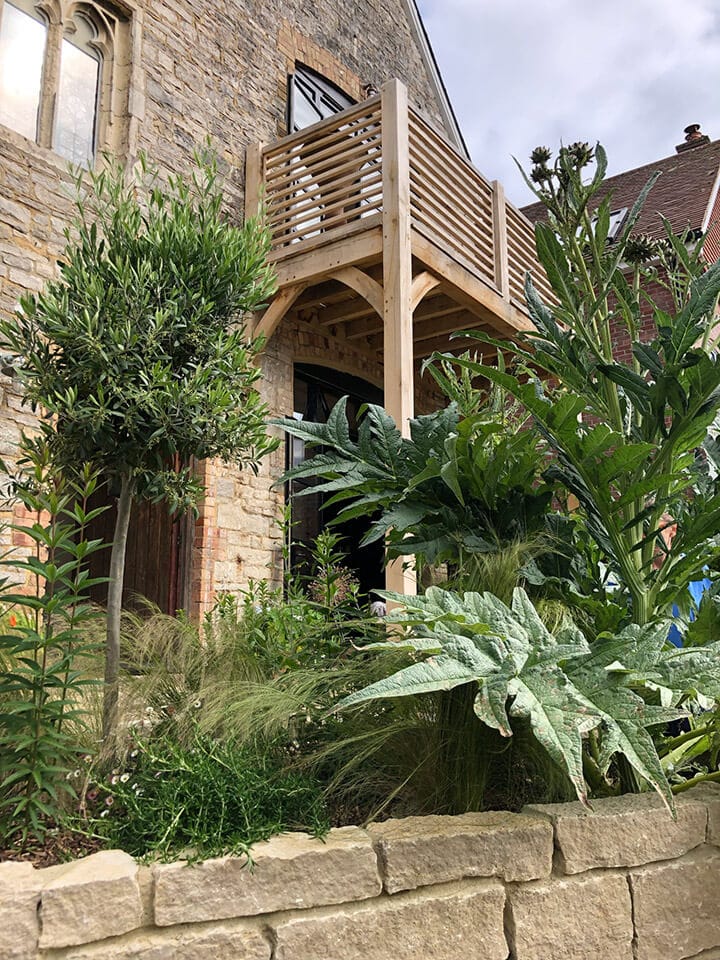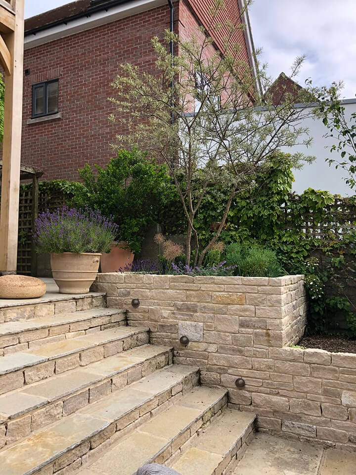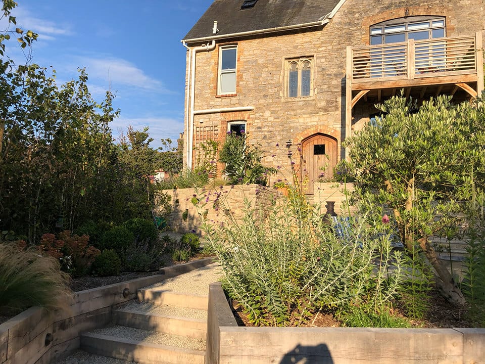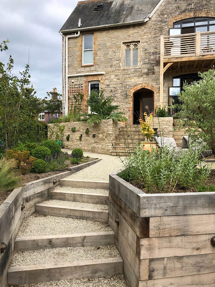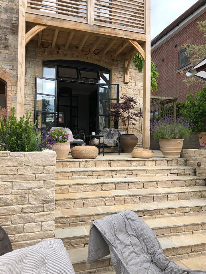 Purbeck stone, oak setts, self binding gravel, Oak sleepers and limestone paving all combine harmoniously to blend seamlessly with the house situated in a sleepy village near Swanage in Dorset.