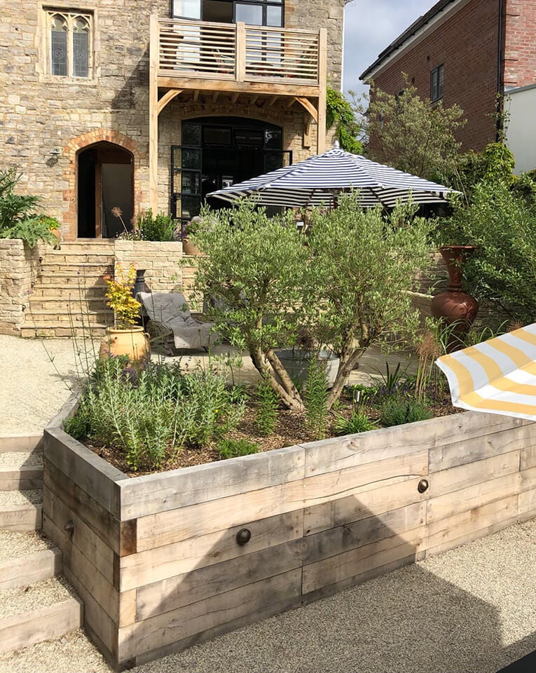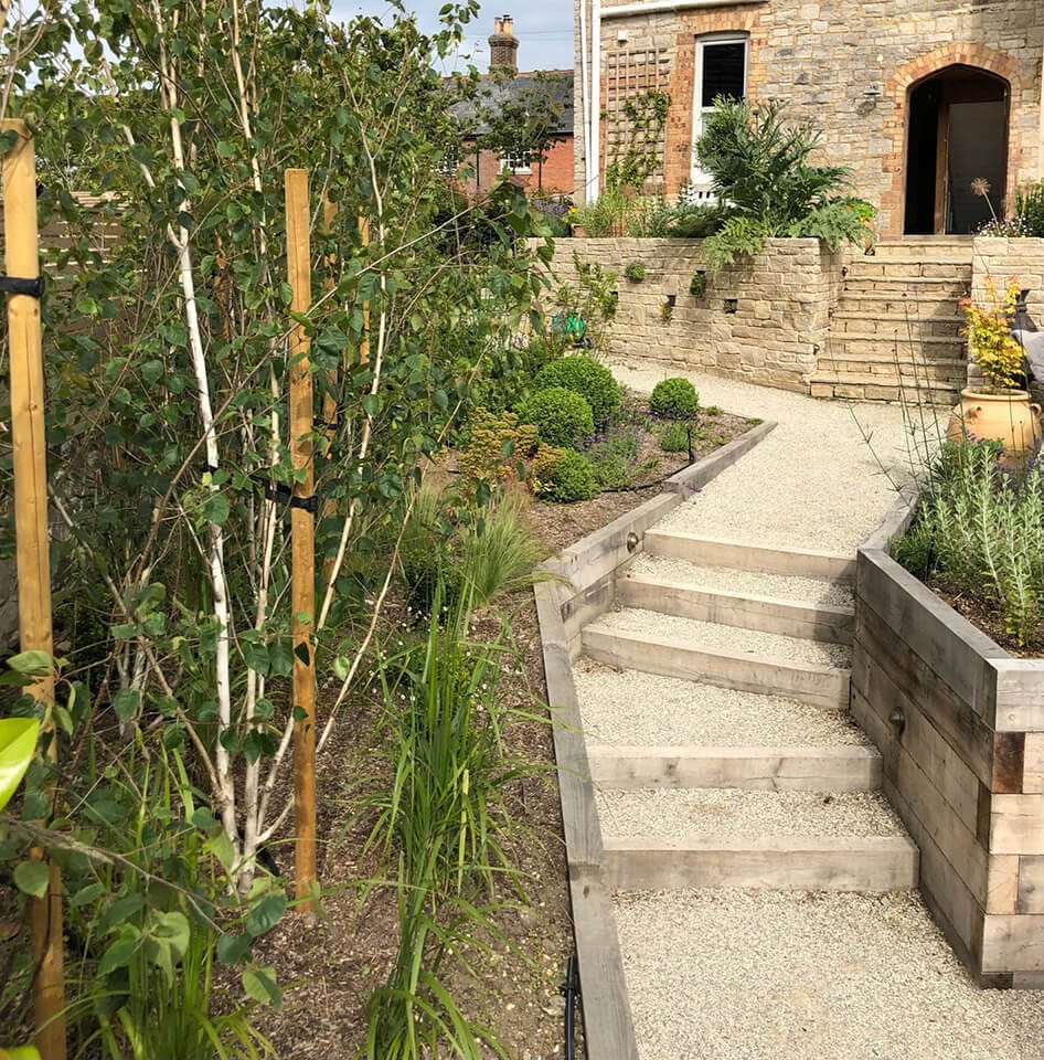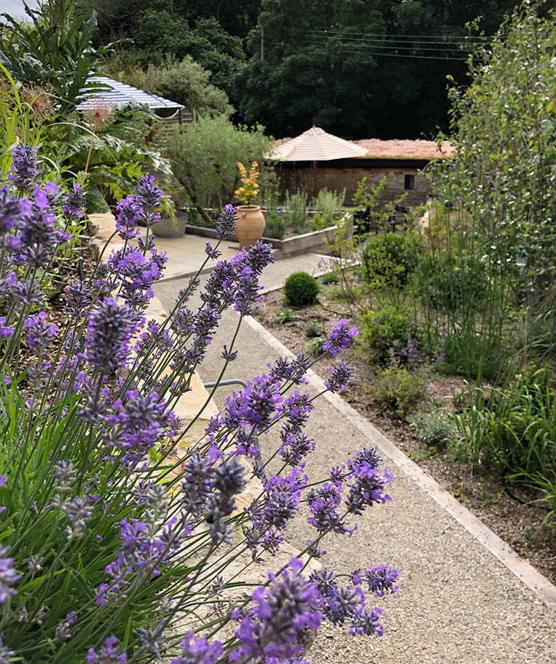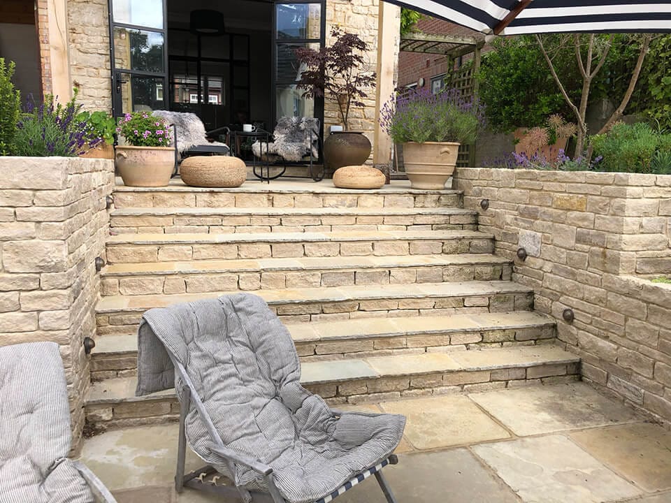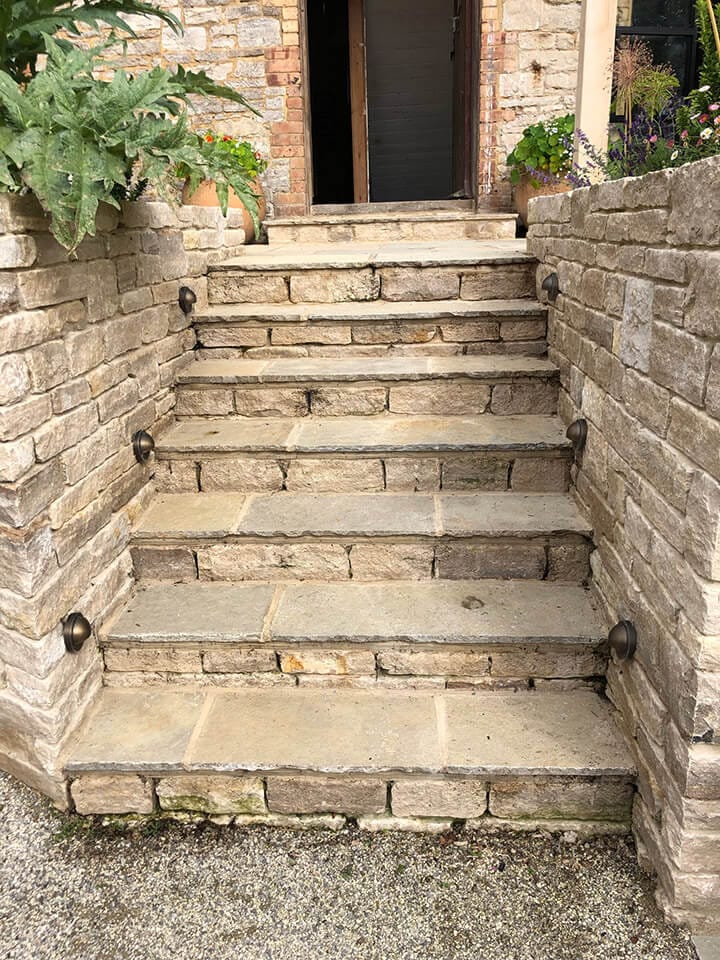 Purbeck stone, oak setts, self binding gravel, Oak sleepers and limestone paving all combine harmoniously to blend seamlessly with the house situated in a sleepy village near Swanage in Dorset.