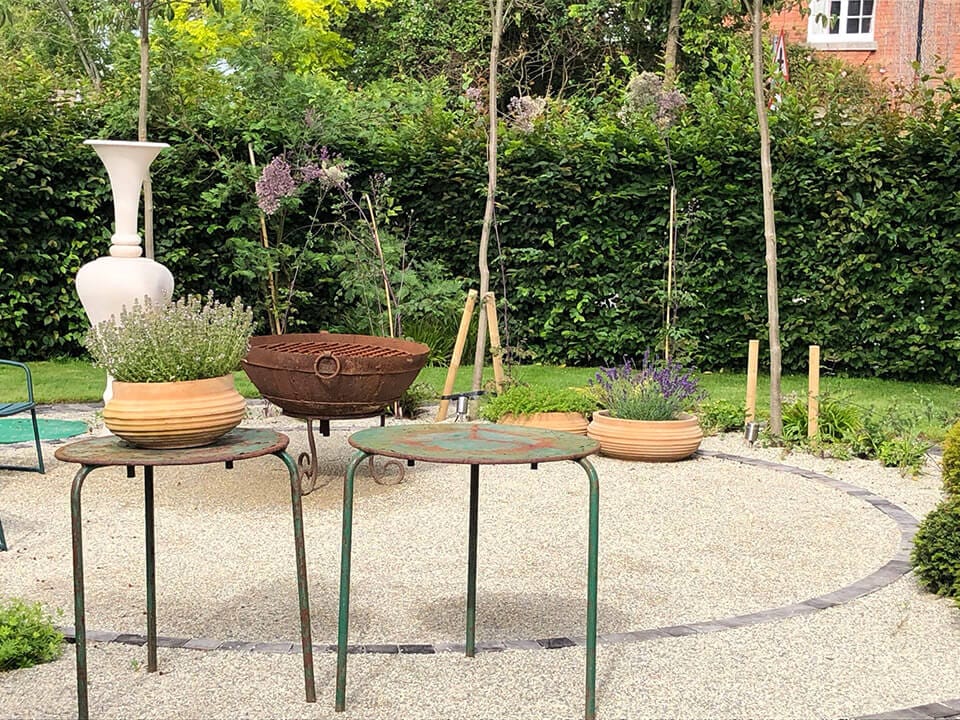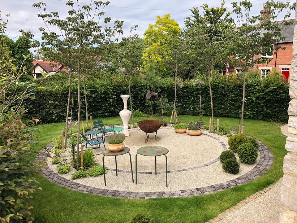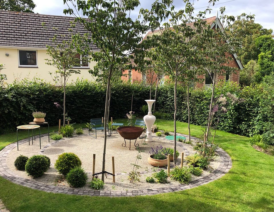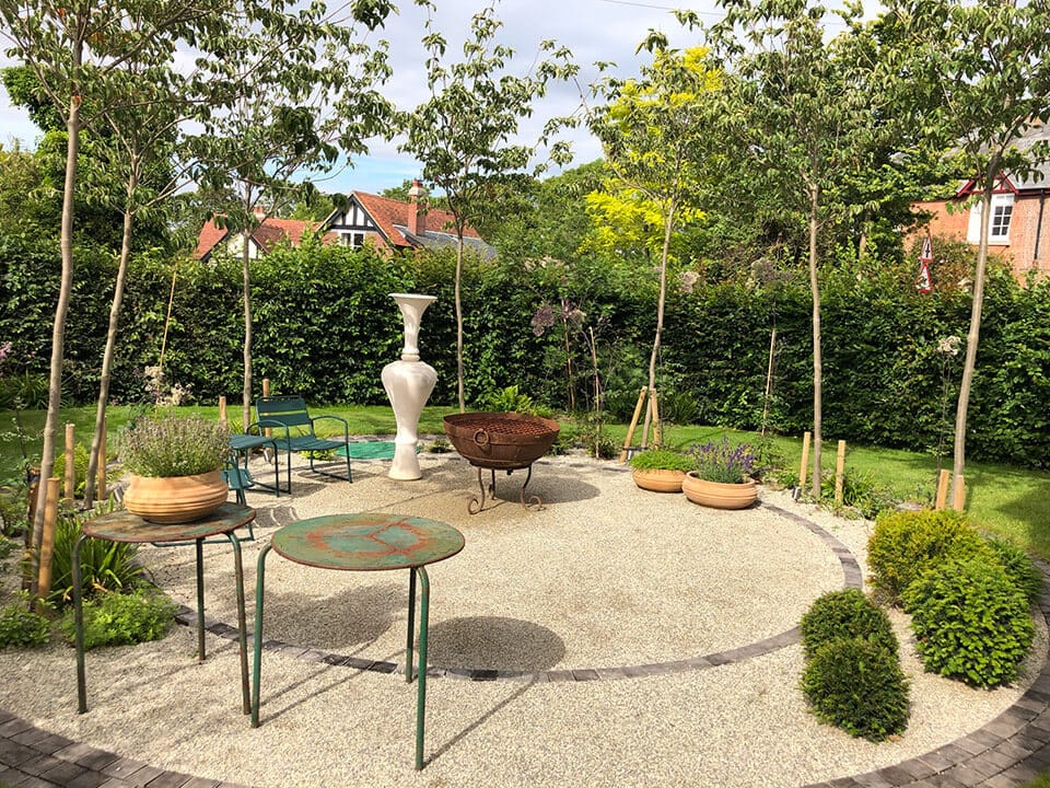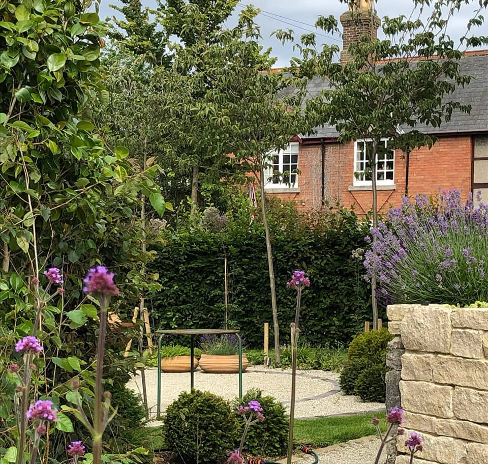 The side garden (originally a garage forecourt) is now enclosed with tall beech hedging and a circular area held by a ring of Cornus that have blended together now. Interwoven planting between the trunks brings a serenity to this space which is used for mindful activities.